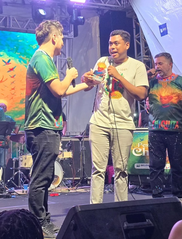 Carlos Brito fazendo o “É do Pará”, ao vivo, na chegada do Círio Fluvial – foto de Fernando Sette