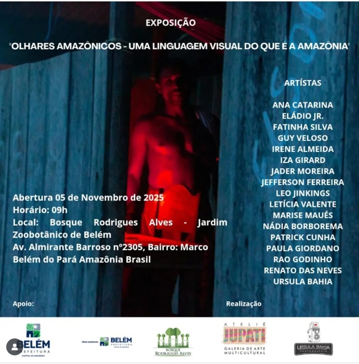Exposição – O ateliê Jupati Galeria de Arte Multicultural promove a exposição fotográfica “Olhares Amazônicos – Uma Linguagem Visual sobre a Amazônia”, com 28 fotografias de 17 artistas visuais, com imagens do cotidiano, festas, povo, religiosidade e outras manifestações do Pará. Os artistas são Ana Catarina, Eládio Jr., Fatinha Silva, Guy Veloso, Irene Almeida, Iza Girard, Jader Moreira, Jefferson Ferreira, Leo Jinkings, Letícia Valente, Marise Maués, Nádia Borborema, Patrick Cunha, Paula Giordano, Rao Godinho, Renato das Neves e Ursula Bahia. A abertura é na quarta-feira, 5 de novembro, às 9h, no Bosque Rodrigues Alves – Jardim Zoobotânico de Belém, na avenida Almirante Barroso, e fica aberta até o dia 7 de dezembro. A visitação durante a COP30, de 6 a 21 de novembro, será das 8 às 16 horas. Haverá outras atividades durante a programação dentro do Bosque Rodrigues Alves. O apoio é da Prefeitura de Belém e Bosque Rodrigues Alves.