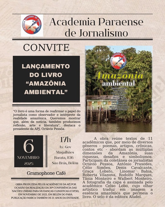 Livro – A Academia Paraense de Jornalismo – APJ celebrou no dia 26 de outubro, 31 anos de fundação. E para marcar a data, fará o lançamento do livro “Amazônia Ambiental”, na quinta-feira, dia 6, no Espaço Gramophone, na avenida Magalhães Barata, em Belém. A obra reúne textos de 11 acadêmicos que, por meio de diversos gêneros, abordam as múltiplas dimensões da Amazônia, suas riquezas, desafios e simbolismos. Os jornalistas no livro são Octávio Pessoa, Antônio Praxedes, Célio Simões, Denis Cavalcante, Graça Lobato, Linomar Bahia, Roberta Vilanova, Rodolfo Marques, Tânia Monteiro e Walbert Monteiro. A fotografia da capa é assinada pelo acadêmico Celso Lobo e o selo é da editora Aludel.