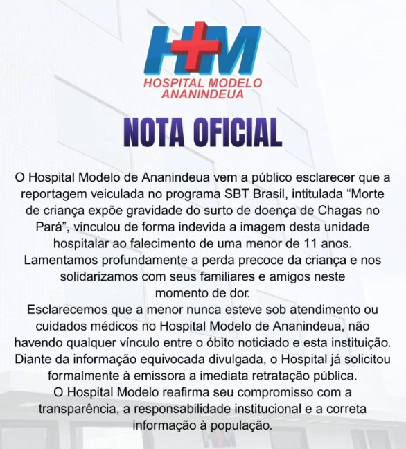 Mentira – Para completar o roteiro tenso, o SBT nacional exibiu, recentemente, uma reportagem com o título “Morte de criança expõe gravidade do surto de doenças de Chagas no Pará”, associando a imagem do Hospital Modelo de Ananindeua, como se a criança tivesse estado nesse local, o que nunca aconteceu. A exibição provocou uma enxurrada de ataques ao hospital, que reagiu publicando nota oficial e exigindo retratação da emissora pelo uso indevido de imagem.