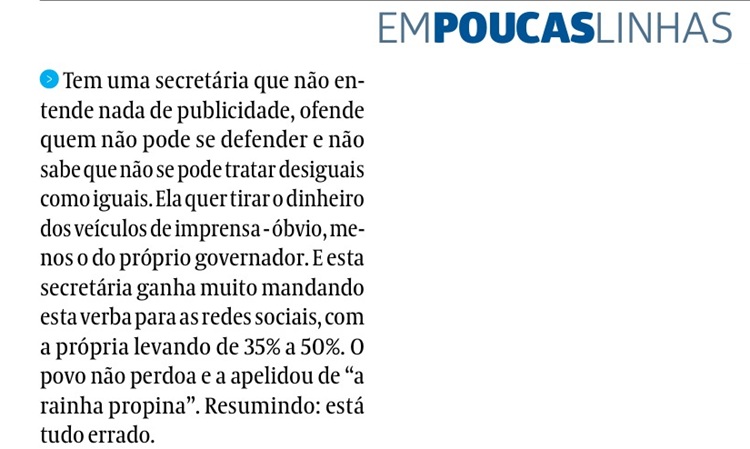 A secretaria INHA – E essa “mais que direta” da coluna Repórter 70, de O Liberal, na terça-feira, 10?: “Tem uma secretária que não entende nada de publicidade, ofende quem não pode se defender e não sabe que não se pode tratar desiguais como iguais. Ela quer tirar o dinheiro dos veículos de imprensa – óbvio, menos o do próprio governador. Esta secretária ganha muito mandando esta verba – desviada – para as redes sociais, com a ela própria levando de 35% a 50%. O povo não perdoa e a apelidou de “a rainha propina”. Assim, meus colegas, em 2020, euzinha publiquei prints de acusações contra essa mesma secretária, que surgiram em lives do Heldisssss, na época da pandemia, afirmando que ela levava, sempre, uma ponta boa nos contratos da secretaria na qual ela é gestora. O que rola, à boca pequena, é que Baiacu e o Chupa Chupa da Marambaia têm que se conformar e dividir essa “cota” com a moça.