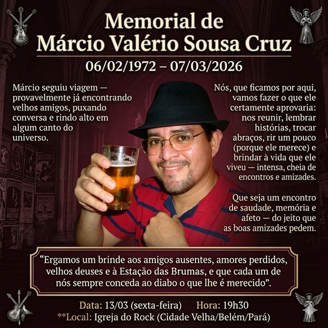 Para Márcio – Márcio tinha acabado de fazer 52 anos. A morte dele deixou uma consternação profunda em todos os colegas. Nesta sexta-feira, 13, será feita uma homenagem a ele no evento “Memorial de Márcio Valério Sousa Cruz”, a partir das 19h39, no bar Igreja do Rock, que ele era quase sócio-proprietário. O bar fica na esquina da avenida Tamandaré com rua 16 de Novembro, no bairro da Cidade Velha.