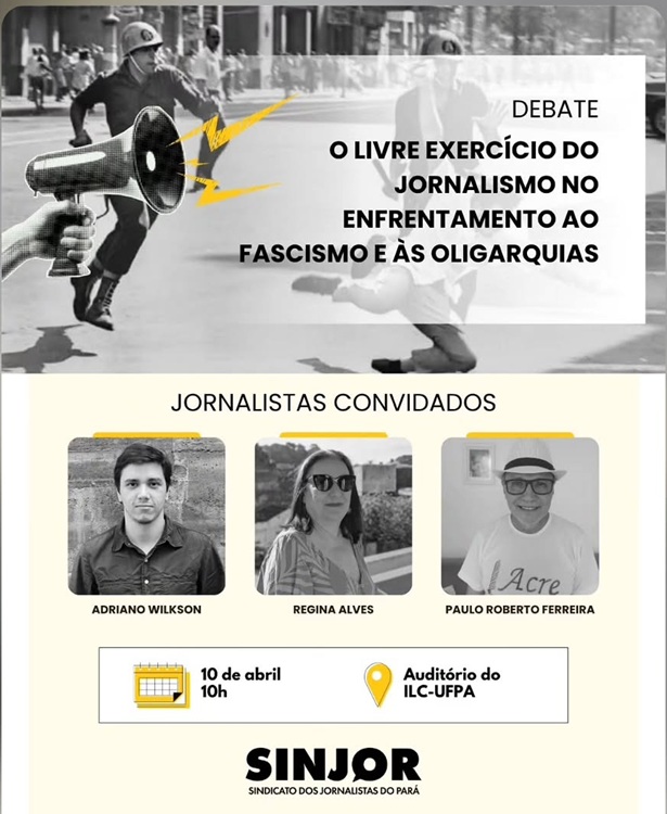 Debate – Há 62 anos, o Brasil passou por um dos períodos mais sombrios de sua história, com torturas, assassinatos, desaparecimentos de ativistas, fechamento do Congresso Nacional, censura e fim da liberdade de imprensa que marcaram a ditadura empresarial-militar brasileira. As ameaças à democracia ainda persistem e para aprofundar essa análise, o Sindicato de Jornalistas do Pará promove na sexta-feira, 10, às 10 horas, no auditório do ILC-UFPA, o debate “O livre exercício do jornalismo no enfrentamento ao fascismo e às oligarquias”. Como debatedores estão o jornalista independente Adriano Wilkson; o ex-editor do jornal Resistência na época da ditadura, Paulo Roberto Ferreira; e a professora aposentada da Facom-UFPA, Regina Alves. Na mediação, o presidente do Sindicato e trabalhador do grupo O Liberal, Vito Gemaque.