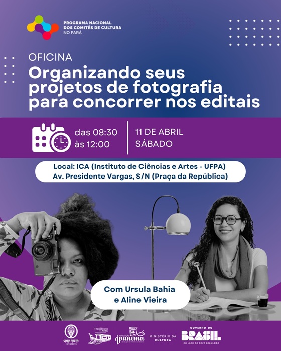 Oficina – No sábado, dia 11, a Caravana de Formação Yandê realizará a oficina “Organizando meus projetos para editais”, com foco especial no segmento da fotografia, trazendo orientações práticas para quem deseja estruturar melhor suas ideias e acessar oportunidades. A formação será conduzida por Ursula Bahia e Aline Vieira, que irão compartilhar metodologias acessíveis para organização de portfólio, escrita de propostas e estratégias para inscrição em editais, considerando a realidade dos fazedores de cultura da Amazônia. O lanche é por conta da formação. Será das 8h30 às 12h, no Instituto de Ciências de Arte da UFPA, na praça da República, bairro da Campina, Belém. Link de inscrição: https://forms.gle/C6mZAUeRUC17irec8